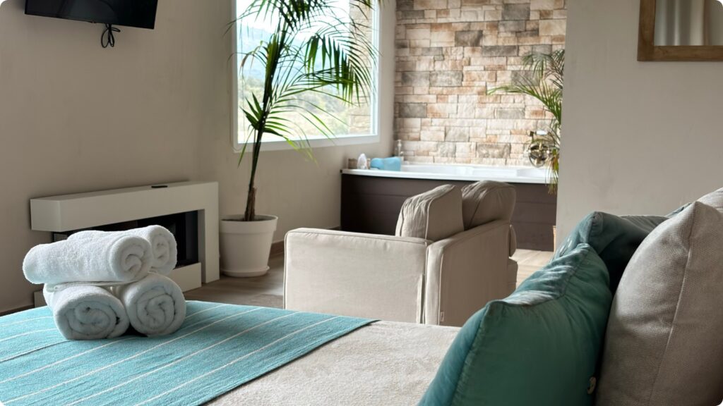 6 Habitaciones Dobles: Espacios llenos de luz, de las cuales tres ofrecen vistas directas a la piscina, una está adaptada para personas con movilidad reducida, otra cuenta con vistas al jardín y nuestra Suite exclusiva que dispone de jacuzzi privado.